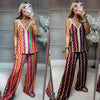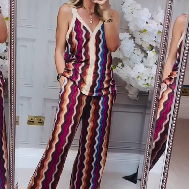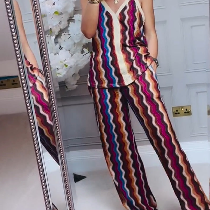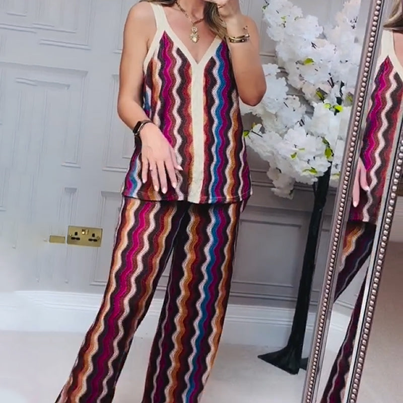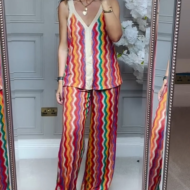 Conjunto de estampado de ondas coloridas-Top con tirantes finos y pantalones de pierna ancha