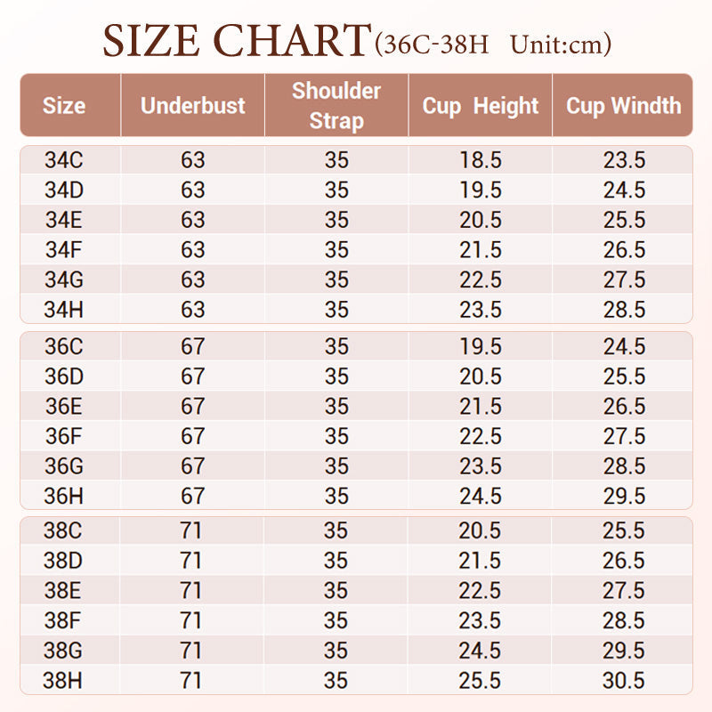 Tamaño: 34C, 36C, 38C, 40C, 42C, 44C, 34D, 36D, 38D, 40D, 42D, 44D, 46D, 34DD, 36DD, 38DD, 40DD, 42DD, 44DD, 46DD, 34G, 36G, 38G, 40G, 42G, 44G, 34H, 36H, 38H, 40H, 42H, 44H, 46H