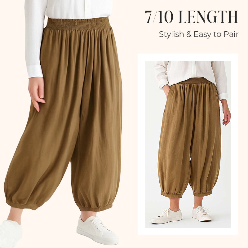 PATA ANCHA DE LINTERNA: el amplio corte de pierna de linterna ofrece un espacio generoso alrededor de los muslos y las pantorrillas, brindando una silueta relajada pero estructurada. A diferencia de los pantalones rectos o cónicos tradicionales, la forma de linterna proporciona una mayor ventilación y facilidad de movimiento, especialmente útil durante los recados diarios, los viajes o el descanso. Es un equilibrio entre comodidad y estilo sutil.