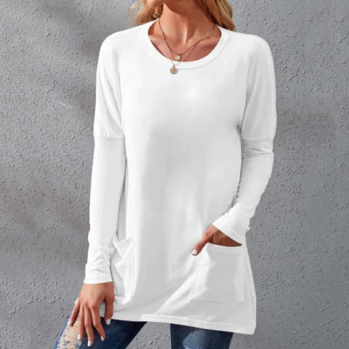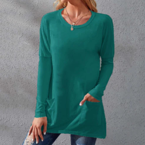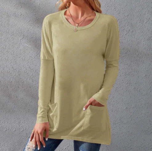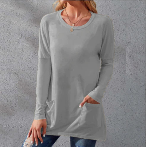 🍂Abraza el ambiente de principios de otoño con esta atrevida camiseta casual de manga larga para mujer, con un elegante cuello redondo y un práctico bolsillo. 🍂Diseñado para brindar comodidad y un estilo sin esfuerzo, es perfecto para usar en capas o solo en días frescos. El ajuste relajado y la tela suave se mueven contigo, lo que lo hace ideal tanto para salidas informales como para momentos acogedores en interiores