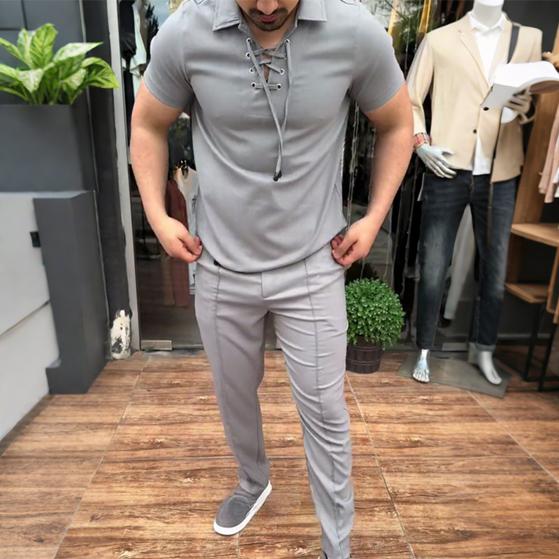 LÍNEAS ELEGANTES, ESTILO REFINADO: la silueta minimalista de este conjunto ofrece una sofisticación nítida con un toque moderno. El detalle de los lazos delanteros en el pecho añade un toque sutil, mientras que el pliegue frontal limpio del pantalón crea un efecto alargado para un acabado pulido.