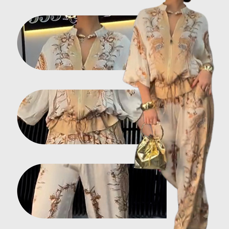 VERSÁTIL JUEGO DE 2 PIEZAS, ESTILO MIX & MATCH: Este imprescindible conjunto de 2 piezas cuenta con una elegante camiseta con cremallera estampada y cómodos pantalones anchos. Perfecto para mezclar y combinar con otros elementos esenciales del guardarropa para un sinfín de atuendos elegantes.