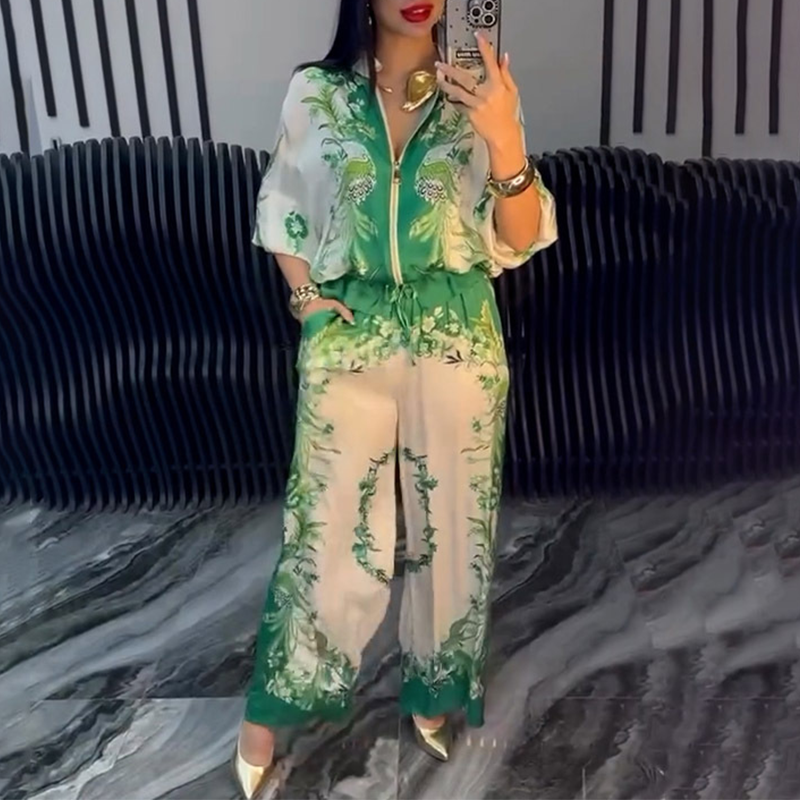Conjunto de 2 piezas de top con cremallera estampada y pantalones de pierna ancha