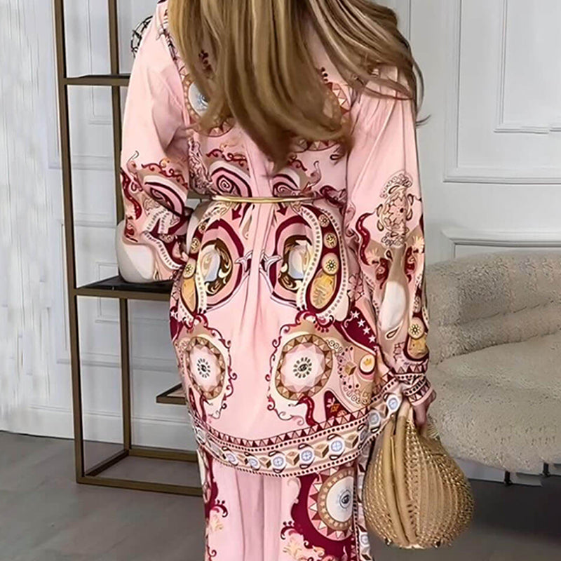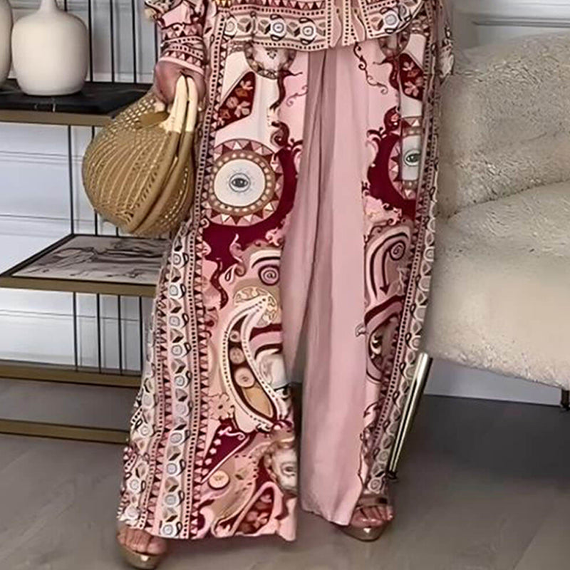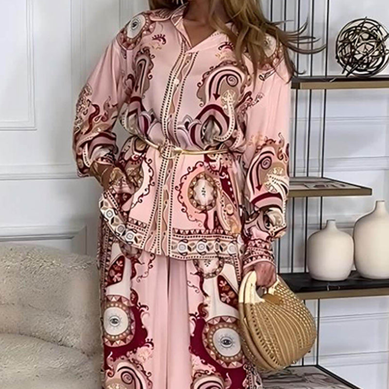 IMPRESIONANTE DISEÑO DE ESTAMPADO ÉTNICO: Eleva tu guardarropa con este llamativo conjunto de 2 piezas con intrincados estampados étnicos. La camiseta de manga larga cuenta con un cuello clásico y un frente con varios botones, mientras que los pantalones de pierna ancha incluyen bolsillos funcionales para una combinación de estilo y practicidad.